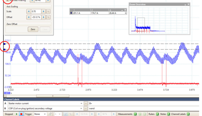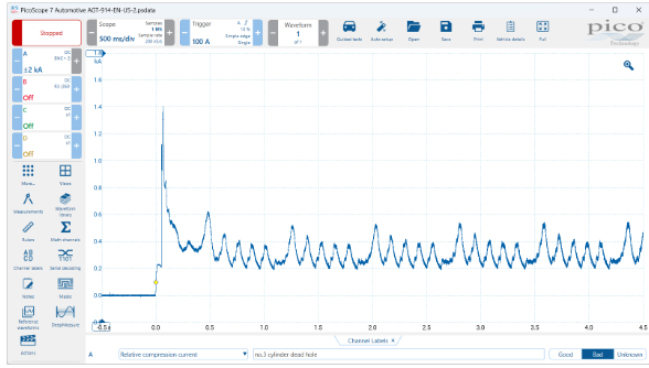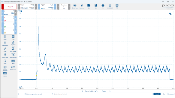 - Analyze the waveform — each current spike represents one cylinder’s compression event